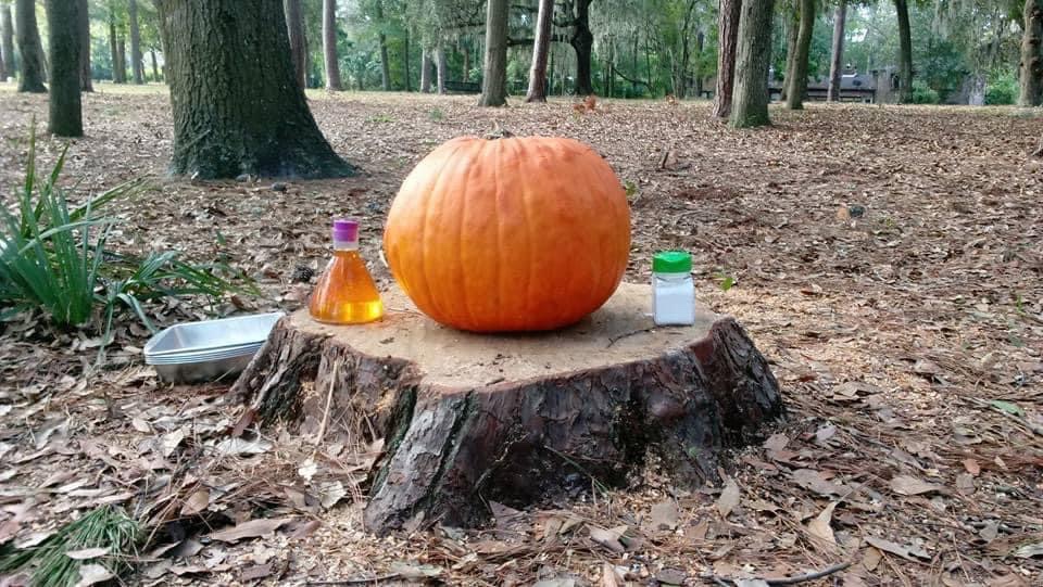 One of our favorite pumpkin activities is best done outdoors and is fabulously messy! (Go figure, I’m recommending something messy and outside!) We like to call it Pumpkin Mad Science and it has held the attention of kiddos from one year old all the way up to fourteen years old and adults as well!