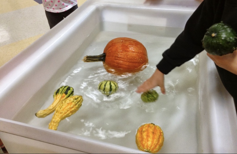 Another fun base in your sensory bin is water! Add the little gourds and pumpkins and let your kiddos play sink or float. You can extend this activity by having your kiddo make a hypothesis (I think the pumpkin will sink/float.) and then see if their hypothesis was correct. Talk about why they think the pumpkin sank/floated and if they think all pumpkins will do the same thing!