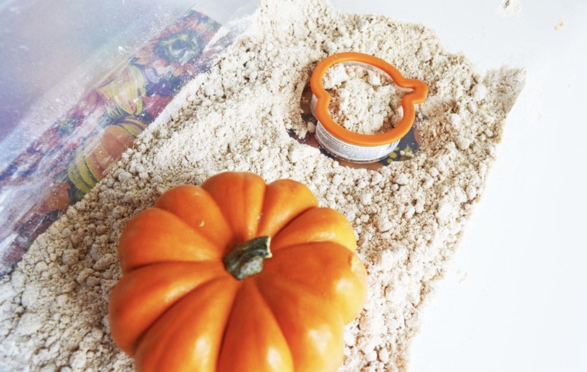 Well, the next activity we love is a pumpkin or gourd sensory bin. Take a Rubbermaid tub and pour in dried corn, kinetic sand, green rice, black beans – anything you want for your base medium. Then add in small pumpkins, gourds, scoops, a magnifying glass, and anything else you think might be fun.